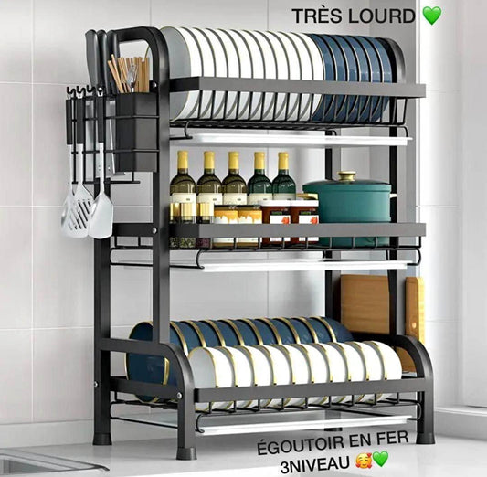 Égouttoir Vaisselle en Fer à 3 Étages | Rangement Cuisine Multifonction avec Support Ustensiles et Plateau Égouttoir
