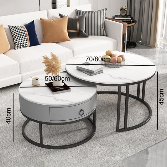 Table basse ronde moderne en marbre blanc avec rangement et structure en métal noir
