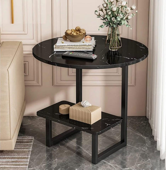 Table basse ronde marbre noir avec étagère de rangement